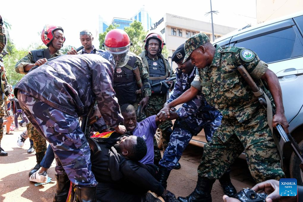 Military and police personnel arrest protesters during the anti-corruption protest in Kampala, the capital of Uganda, July 23, 2024. (Photo by Hajarah Nalwadda/Xinhua)