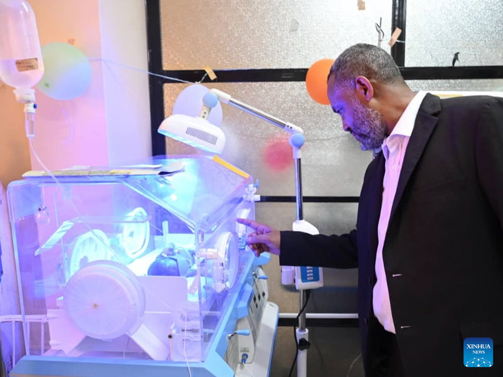 This photo taken with a mobile phone shows Sudan's Health Minister Haitham Mohamed Ibrahim standing next to a new-born baby incubator at Elbuluk Pediatric Hospital in Omdurman city, Sudan, July 13, 2024.(Sudanese Ministry of Health/Handout via Xinhua)