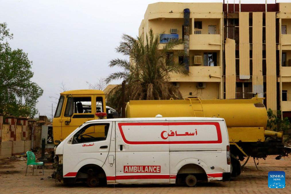 Photo taken on July 23, 2024 shows a damaged ambulance at Omdurman Teaching Hospital at Alshohada neighborhood in Omdurman city, Sudan. (Xinhua/Mohamed Khidir)
