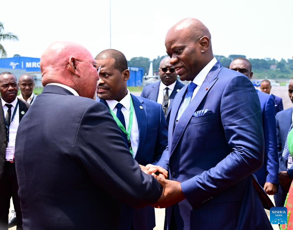 Ugandan Foreign Minister Jeje Odongo (L, front) welcomes visiting Transitional President of Gabon Brice Clotaire Oligui Nguema (C, front) at Entebbe International Airport, Uganda, Aug. 1, 2024. Transitional President of Gabon Brice Clotaire Oligui Nguema on Thursday arrived in Uganda for a three-day official visit.
