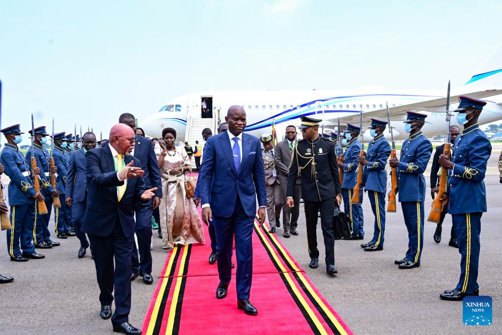 Nguema and First Lady Zita Nguema were received by Ugandan President Yoweri Museveni and First Lady Janet Museveni at State House Entebbe, about 40 km south of the capital, Kampala. (Uganda Presidential Press Unit/Handout via Xinhua)