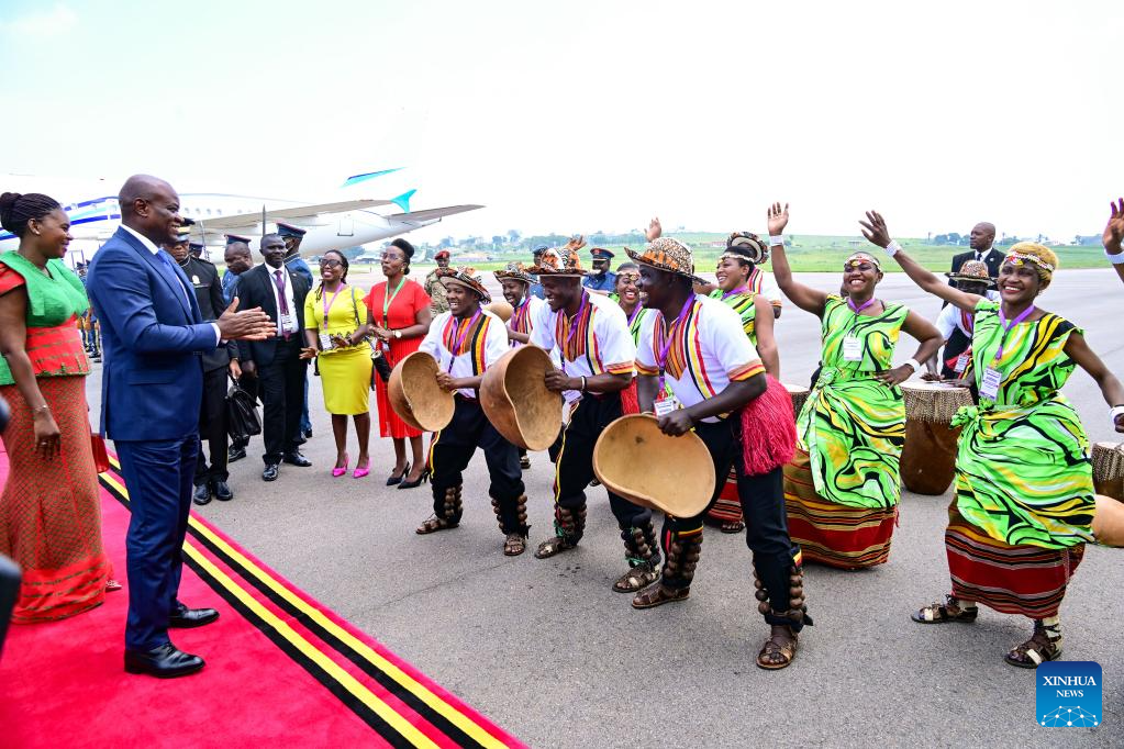 Transitional President of Gabon Brice Clotaire Oligui Nguema (2nd L) and his wife Zita Nguema (1st L) are welcomed by a dance group upon their arrival at Entebbe International Airport, Uganda, Aug. 1, 2024. Transitional President of Gabon Brice Clotaire Oligui Nguema on Thursday arrived in Uganda for a three-day official visit.