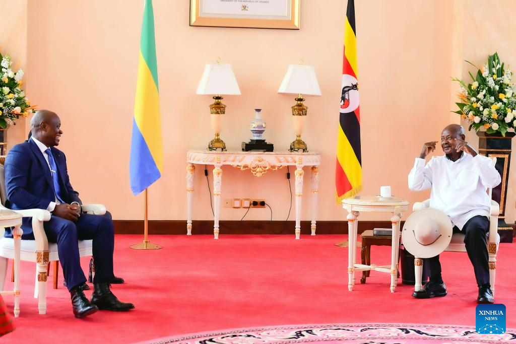 Transitional President of Gabon Brice Clotaire Oligui Nguema (L) meets with Ugandan President Yoweri Museveni in Entebbe, Uganda on Aug. 1, 2024. Nguema on Thursday arrived in Uganda for a three-day official visit. (Uganda Presidential Press Unit/Handout via Xinhua)
