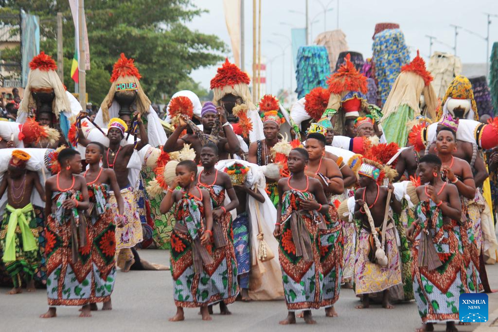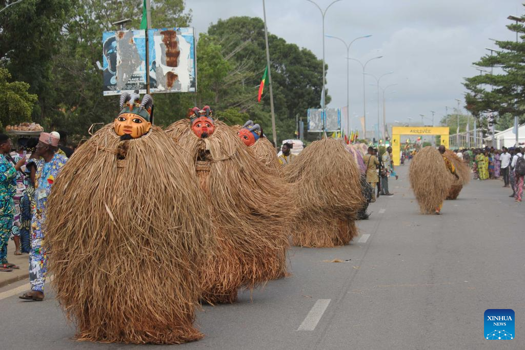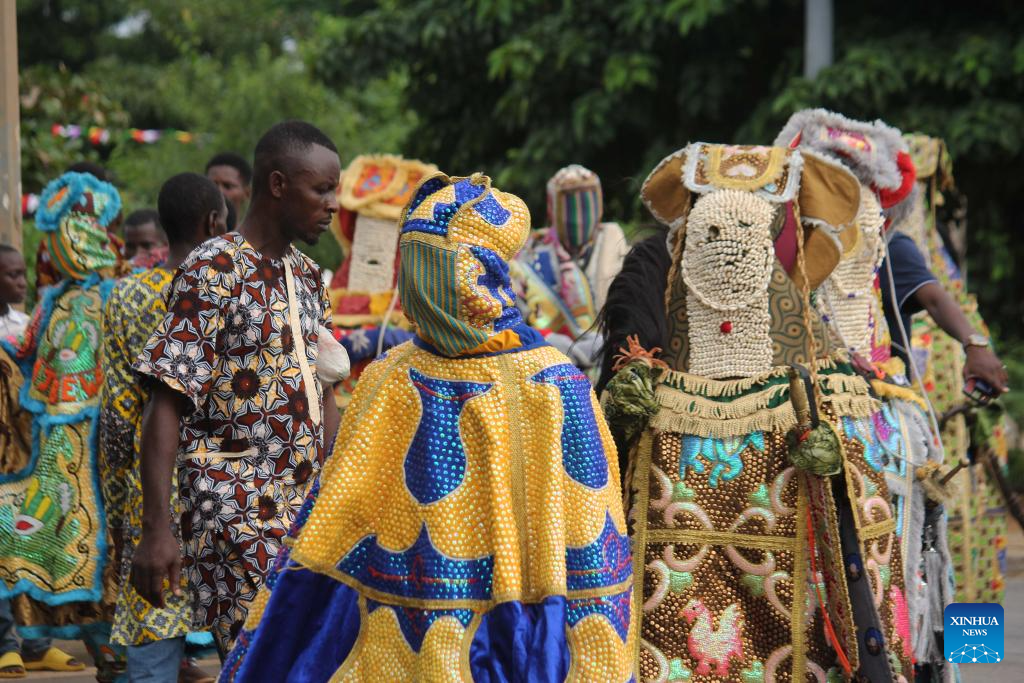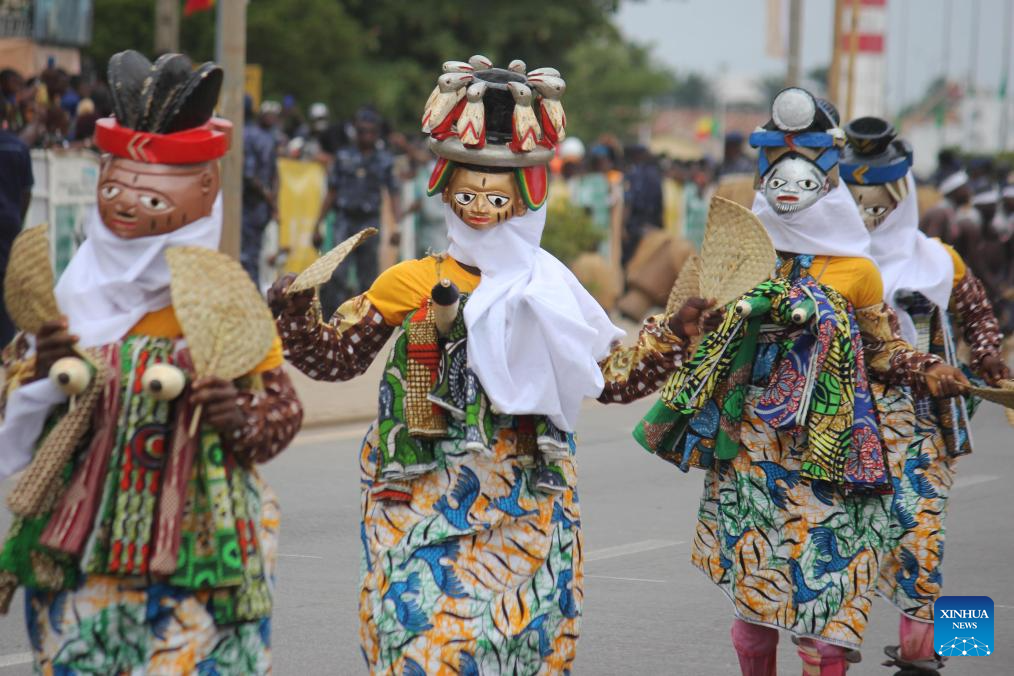 People in costumes perform in a mask parade during the Porto Novo Mask Festival in Porto Novo, Benin, Aug. 4, 2024. The festival was held here from Friday to Sunday to showcase the art and culture of Benin's traditional religion Vodun through a mask parade, concerts, seminars and other activities. (Photo by Seraphin Zounyekpe/Xinhua)