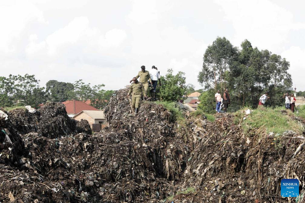 Police officers search the site of a landslide at Kiteezi landfill in Kampala, Uganda on Aug. 11, 2024. The death toll of the garbage dump landslide in Kampala city's Kawempe Division, central Uganda, has climbed to 18, said Lillian Aber, the minister of state for relief, disaster preparedness and refugees, on Sunday. (Photo by Hajarah Nalwadda/Xinhua)