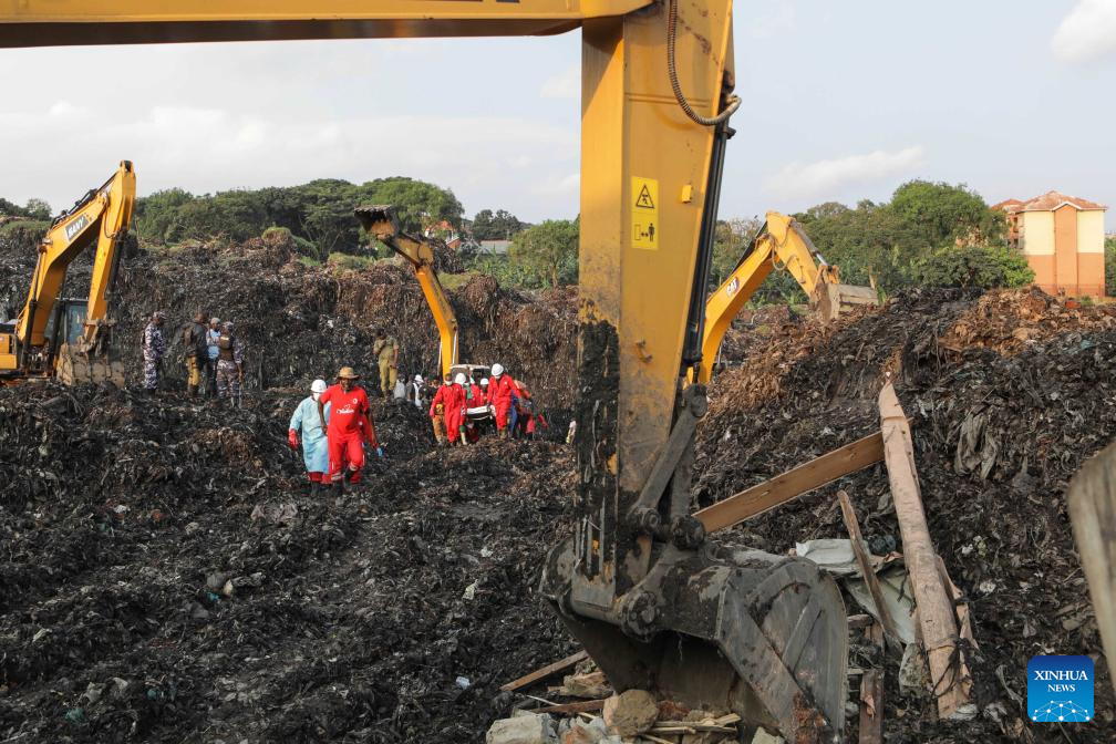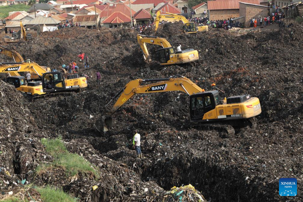 Rescuers operate excavators in search of victims at the site of a landslide at Kiteezi landfill in Kampala, Uganda on Aug. 11, 2024. The death toll of the garbage dump landslide in Kampala city's Kawempe Division, central Uganda, has climbed to 18, said Lillian Aber, the minister of state for relief, disaster preparedness and refugees, on Sunday. (Photo by Hajarah Nalwadda/Xinhua)