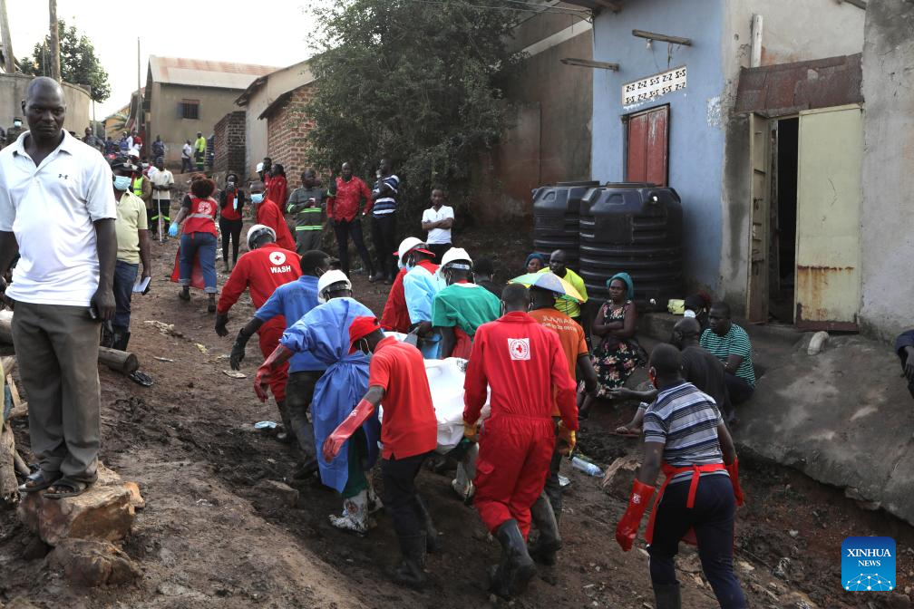 Uganda Red Cross volunteers move the body of a victim retrieved from a landslide at Kiteezi landfill in Kampala, Uganda on Aug. 11, 2024. The death toll of the garbage dump landslide in Kampala city's Kawempe Division, central Uganda, has climbed to 18, said Lillian Aber, the minister of state for relief, disaster preparedness and refugees, on Sunday. (Photo by Hajarah Nalwadda/Xinhua)