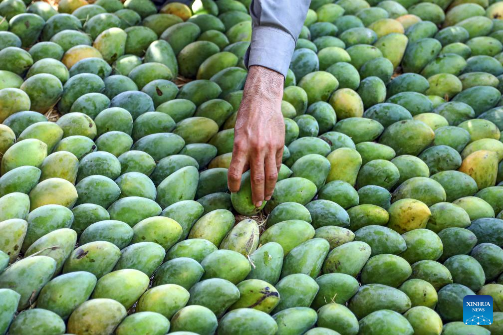 A farmer arranges newly harvested mangoes at a farm in Ismailia Governorate, Egypt, Aug. 11, 2024. Mangoes have entered harvest season in Egypt. (Xinhua/Ahmed Gomaa)