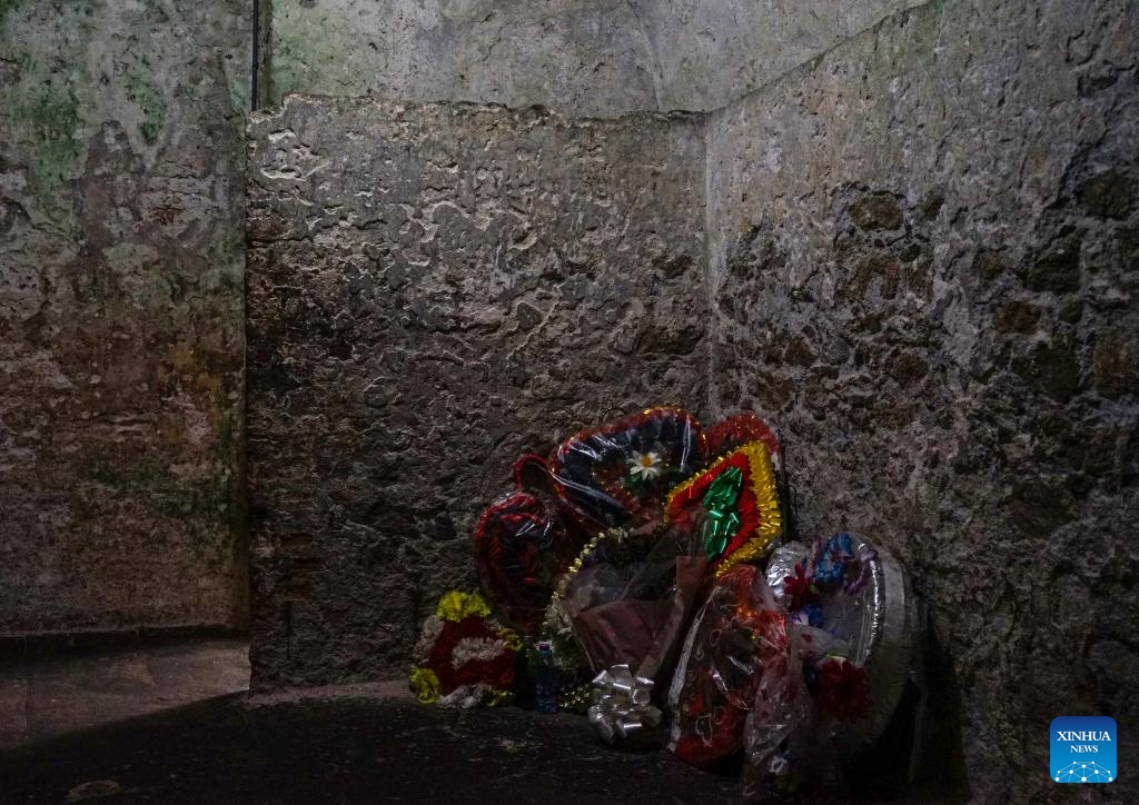 This photo taken on June 19, 2024 shows wreaths in the dungeon of Cape Coast Castle, a former slave holding facility, in Cape Coast, Ghana. "Slave Coast" refers to a historic region along the West African coast. The name is derived from the trans-Atlantic slave trade on the continent.
