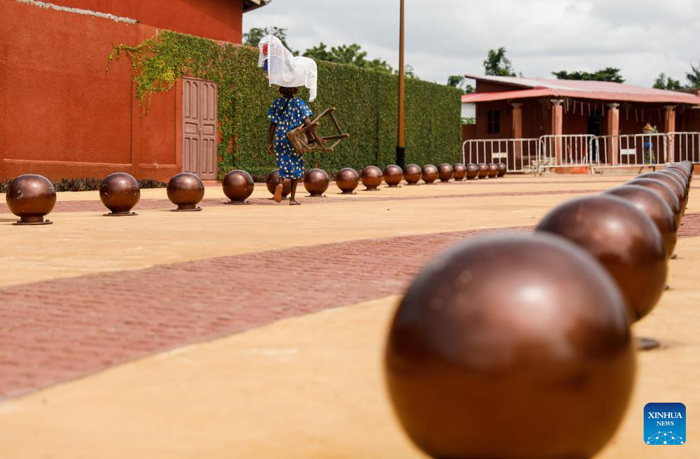 A woman walks through Place Chacha in Ouidah, Benin on May 27, 2024. The spherical decorations on the ground represent the slaves who were sold here. "Slave Coast" refers to a historic region along the West African coast. The name is derived from the trans-Atlantic slave trade on the continent.