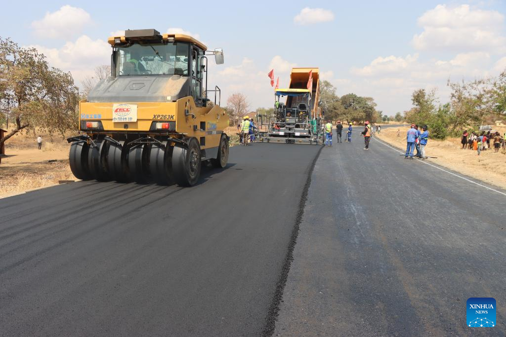 Photo taken on Aug. 27, 2024 shows asphalt pavement works on Malawi's M5 Road in Nkhotakota district, Malawi. China Railway 20th Bureau Group (CR20) on Tuesday started asphalt pavement works for the rehabilitation of a 60-km stretch on Malawi's M5 Road to ease transportation pressure of goods and people along the lakeshore districts. (China Railway 20th Bureau Group/Handout via Xinhua)