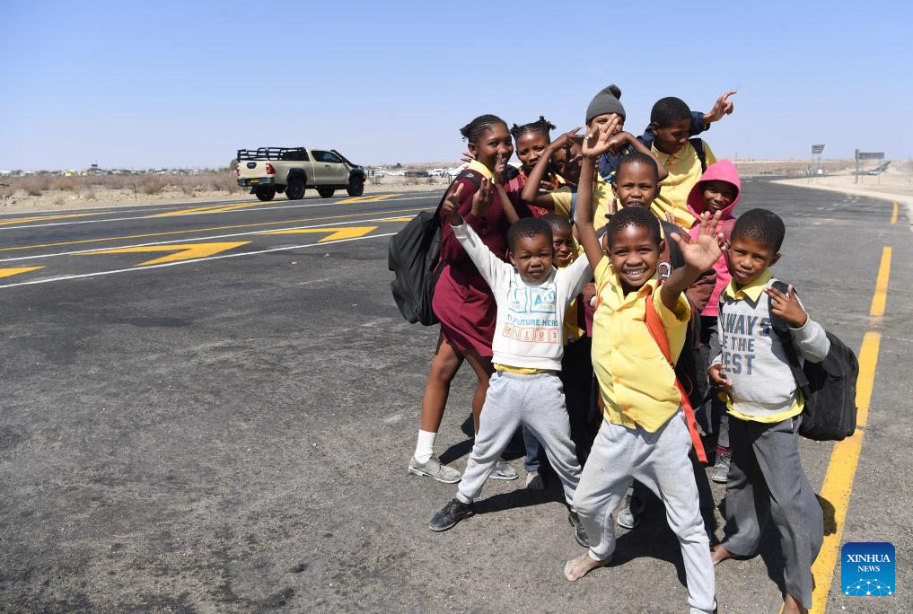 Children pose for a photo during a ceremony held to celebrate the commissioning of the B1 highway in Tses, Namibia, Sept. 3, 2024. (Xinhua/Chen Cheng)