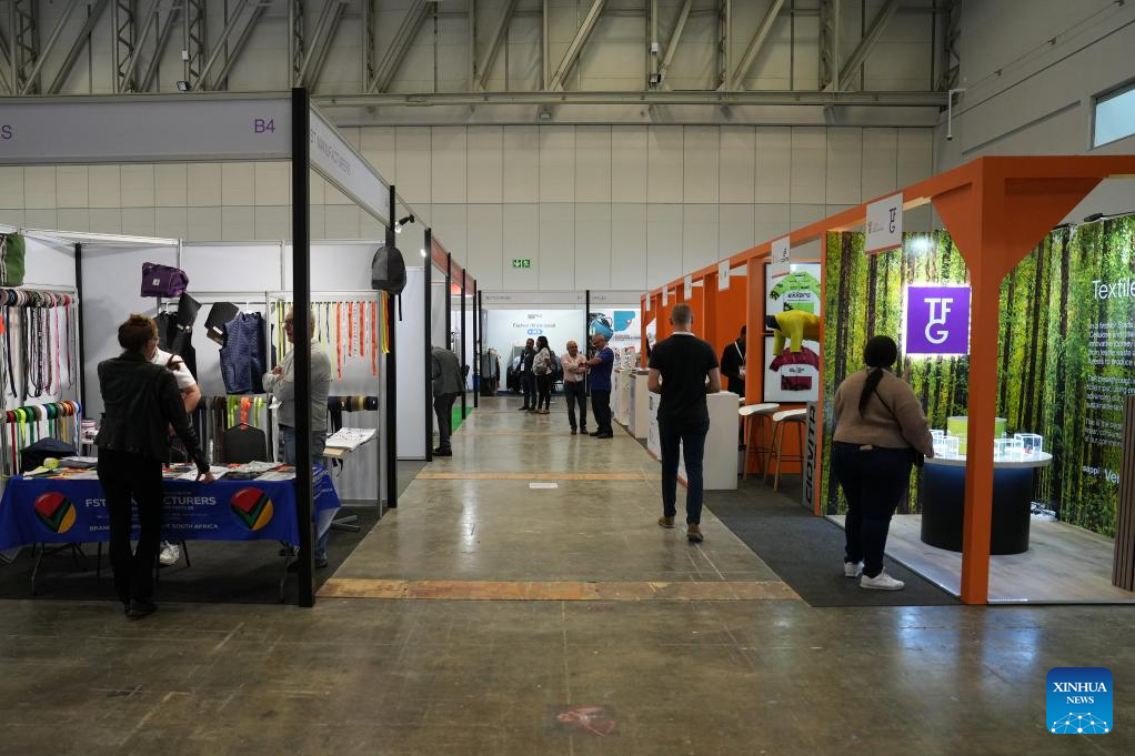 People visit a booth at the Allfashion Sourcing exhibition in Cape Town, South Africa, on Sept. 10, 2024. The Allfashion Sourcing exhibition, a renowned annual fashion and textile trade show, kicked off on Tuesday in Cape Town, the legislative capital of South Africa. (Xinhua/Wang Lei)