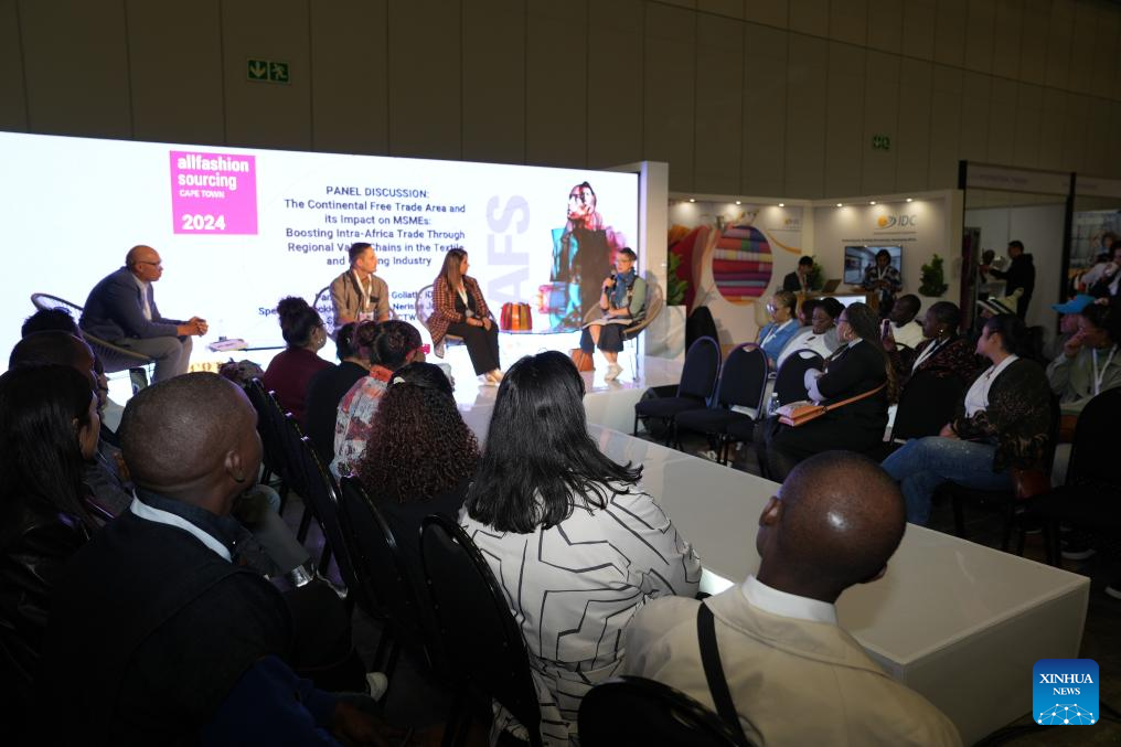 People attend a panel discussion at the Allfashion Sourcing exhibition in Cape Town, South Africa, on Sept. 10, 2024. The Allfashion Sourcing exhibition, a renowned annual fashion and textile trade show, kicked off on Tuesday in Cape Town, the legislative capital of South Africa. (Xinhua/Wang Lei)