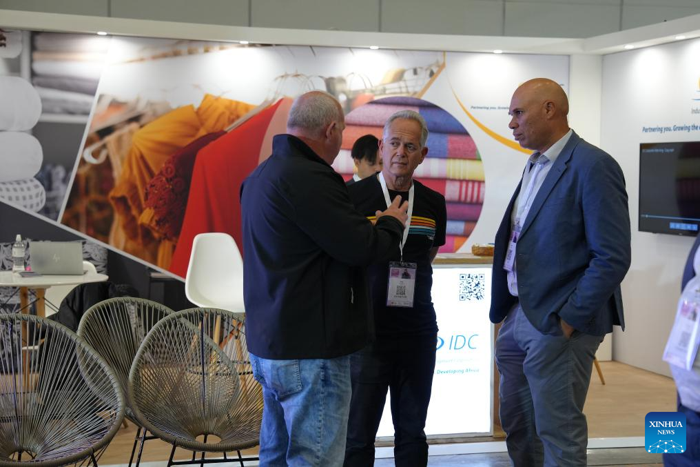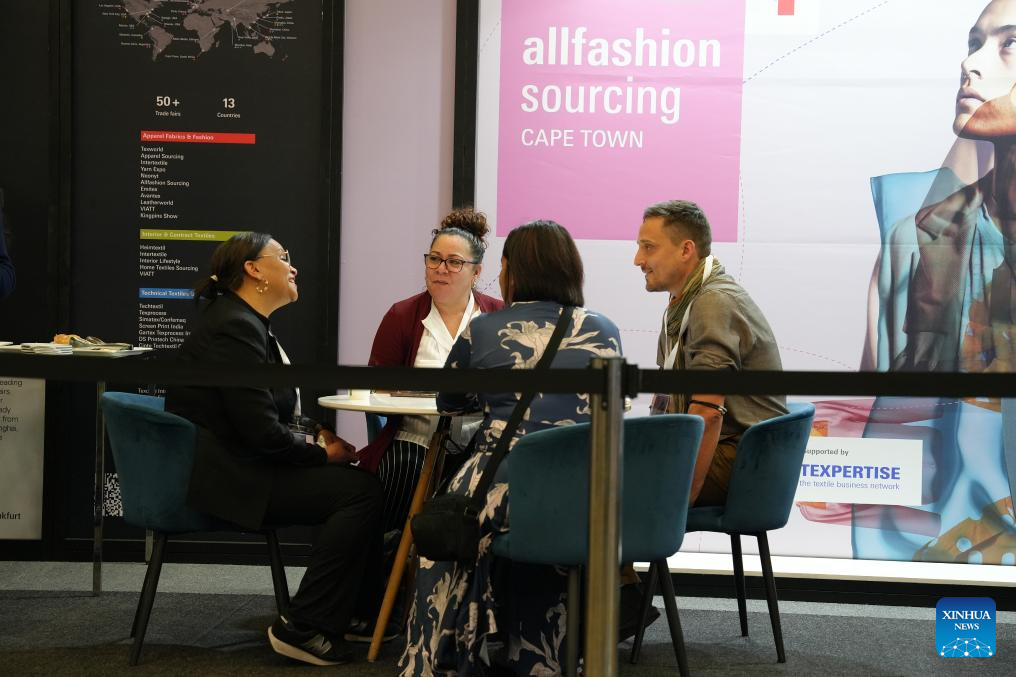 People communicate at the Allfashion Sourcing exhibition in Cape Town, South Africa, on Sept. 10, 2024. The Allfashion Sourcing exhibition, a renowned annual fashion and textile trade show, kicked off on Tuesday in Cape Town, the legislative capital of South Africa. (Xinhua/Wang Lei)