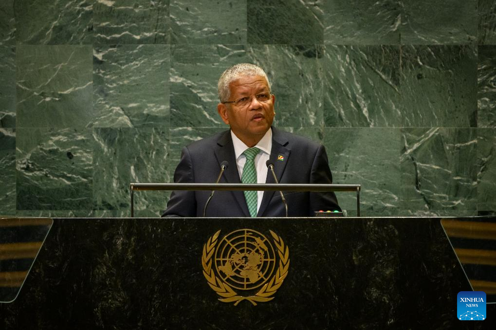 UNITED NATIONS, Sept. 25 (Xinhua) -- The international community cannot hope to advance sustainable development when some race ahead while others are left to struggle, in other words, no one should be left behind, Seychelles' President Wavel Ramkalawan on Wednesday told the General Debate of the ongoing 79th session of the United Nations General Assembly.