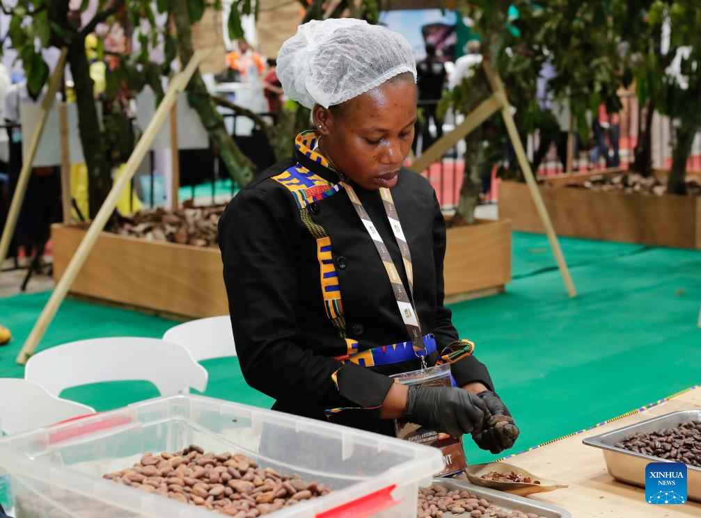 An exhibitor processes dried cocoa beans during the 9th National Cocoa and Chocolate Day in Abidjan, Cote d'Ivoire, Sept. 28, 2024. The event was held in Abidjan from Sept. 28 to 30. (Photo by Laurent Idibouo/Xinhua)