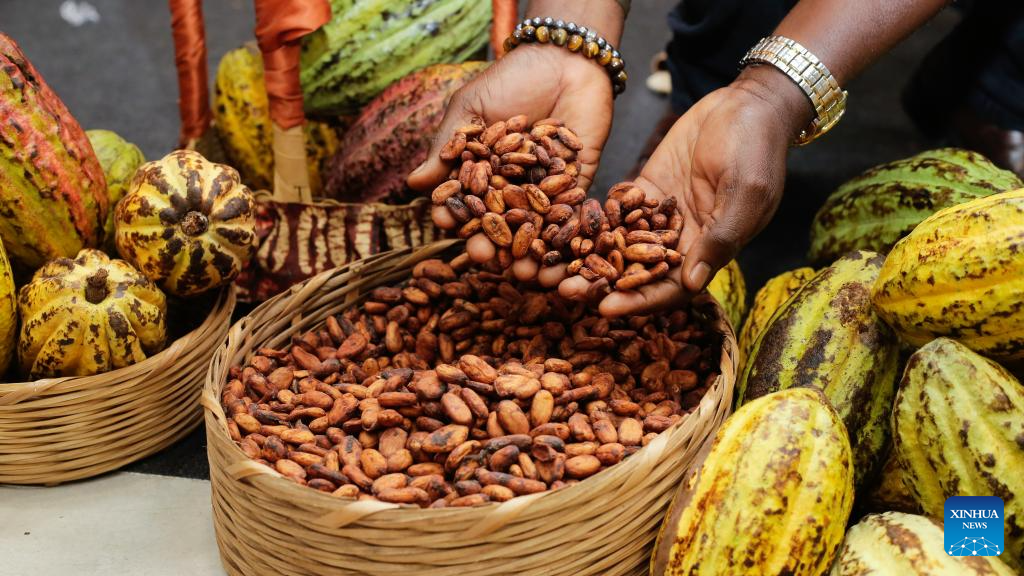 An exhibitor displays dried cocoa beans during the 9th National Cocoa and Chocolate Day in Abidjan, Cote d'Ivoire, Sept. 28, 2024. The event was held in Abidjan from Sept. 28 to 30. (Photo by Laurent Idibouo/Xinhua)