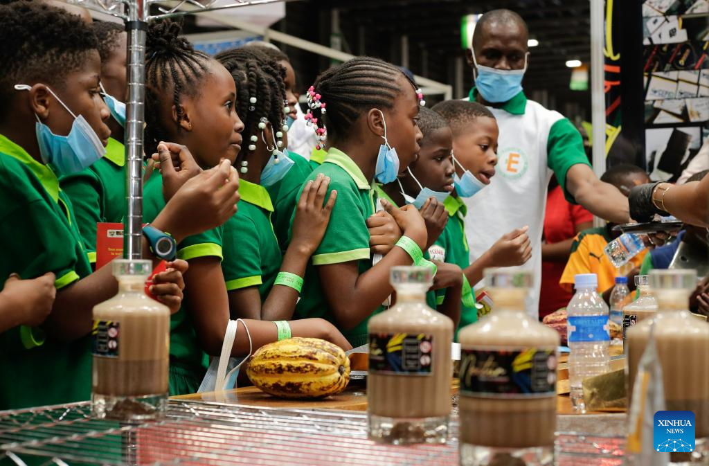Children enjoy chocolate during the 9th National Cocoa and Chocolate Day in Abidjan, Cote d'Ivoire, Sept. 28, 2024. The event was held in Abidjan from Sept. 28 to 30. (Photo by Laurent Idibouo/Xinhua)