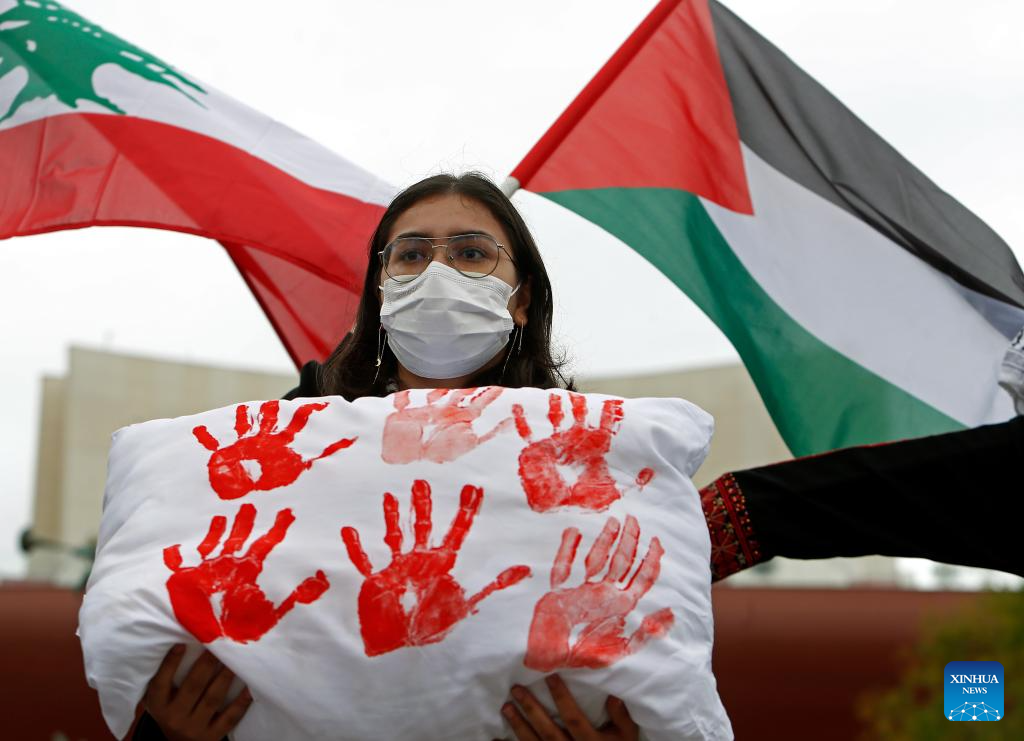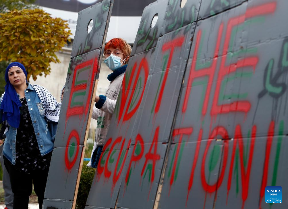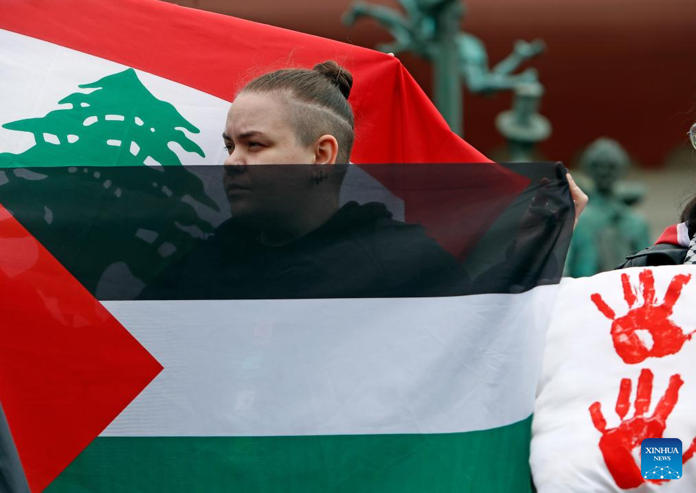 People attend a rally in support of Palestine and Lebanon in Bucharest, Romania, Oct. 12, 2024. (Photo by Cristian Cristel/Xinhua)