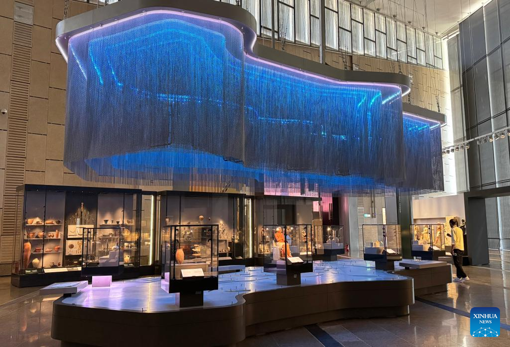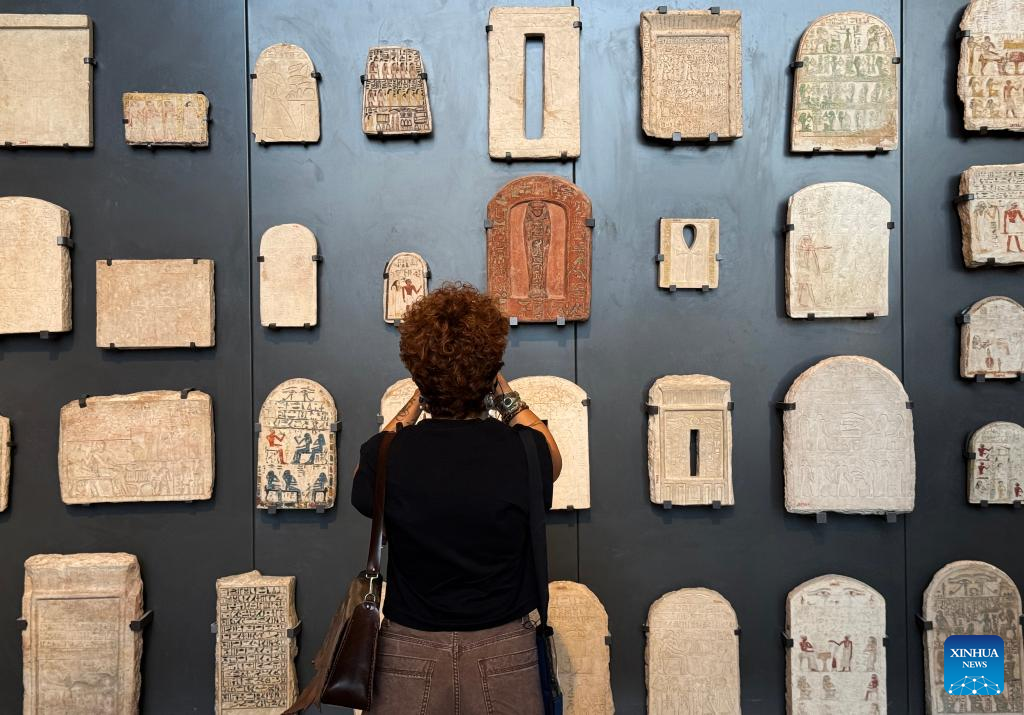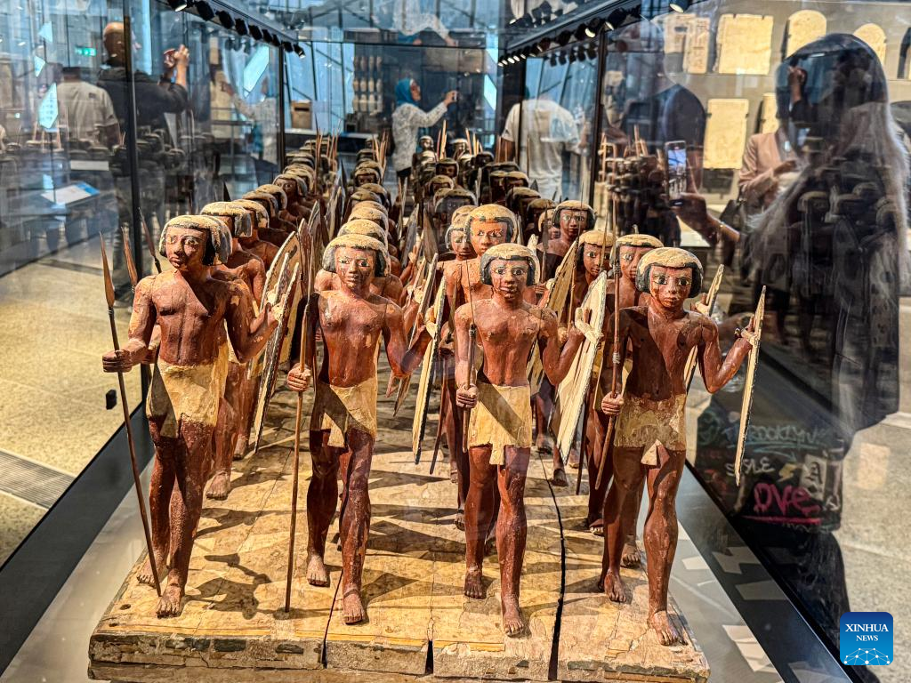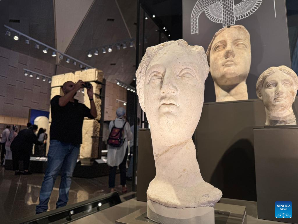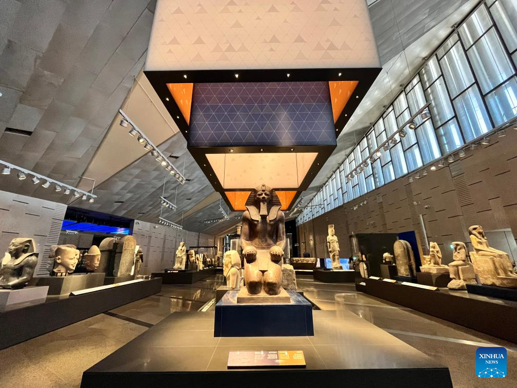 This photo taken on Oct. 15, 2024 shows exhibits at an exhibition hall of the Grand Egyptian Museum in Giza, Egypt. The Grand Egyptian Museum on Tuesday announced trial operations of its Main Galleries, starting from Oct. 16, 2024, offering visitors an exclusive preview of twelve exhibition halls with artifacts spanning from prehistoric times to the Roman era. This trial phase is part of the museum's ongoing efforts to ensure a seamless visitor experience ahead of its official opening. (Xinhua/Wang Dongzhen)