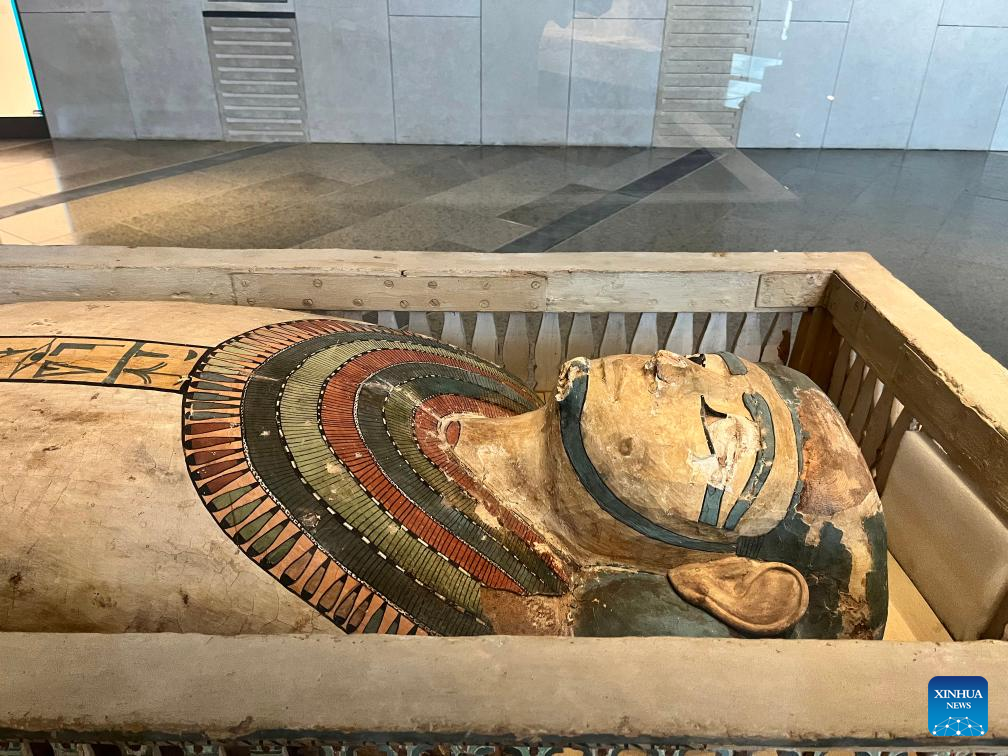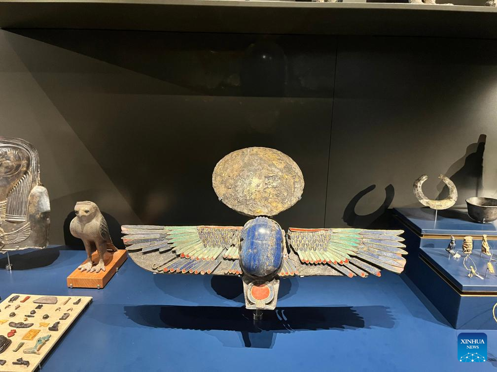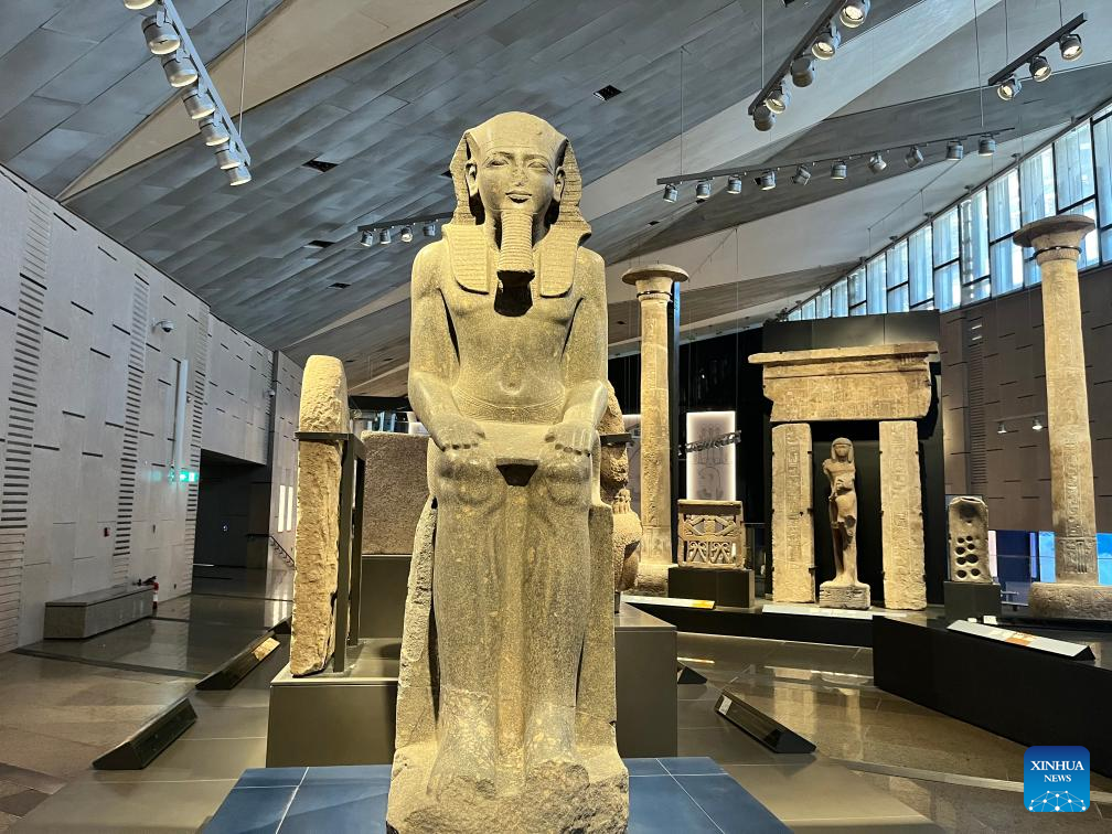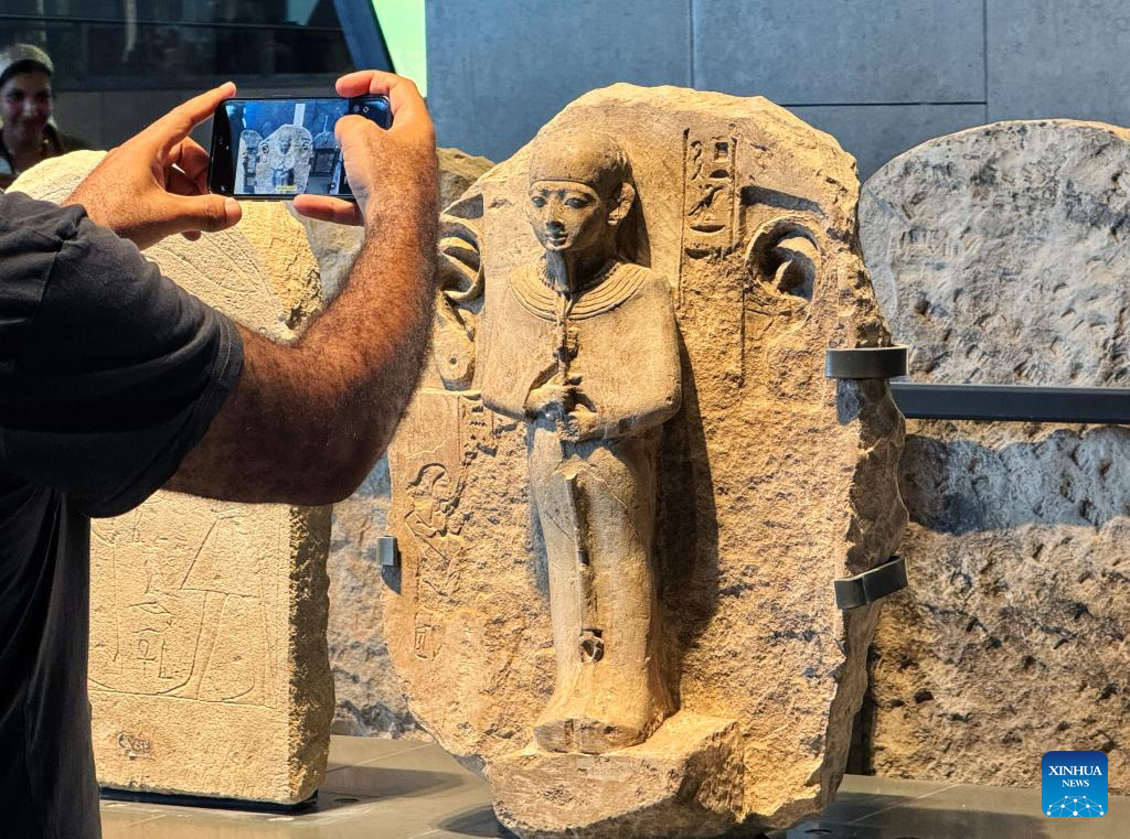 This photo taken on Oct. 15, 2024 shows an exhibit at an exhibition hall of the Grand Egyptian Museum in Giza, Egypt. The Grand Egyptian Museum on Tuesday announced trial operations of its Main Galleries, starting from Oct. 16, 2024, offering visitors an exclusive preview of twelve exhibition halls with artifacts spanning from prehistoric times to the Roman era. This trial phase is part of the museum's ongoing efforts to ensure a seamless visitor experience ahead of its official opening. (Xinhua/Sui Xiankai)