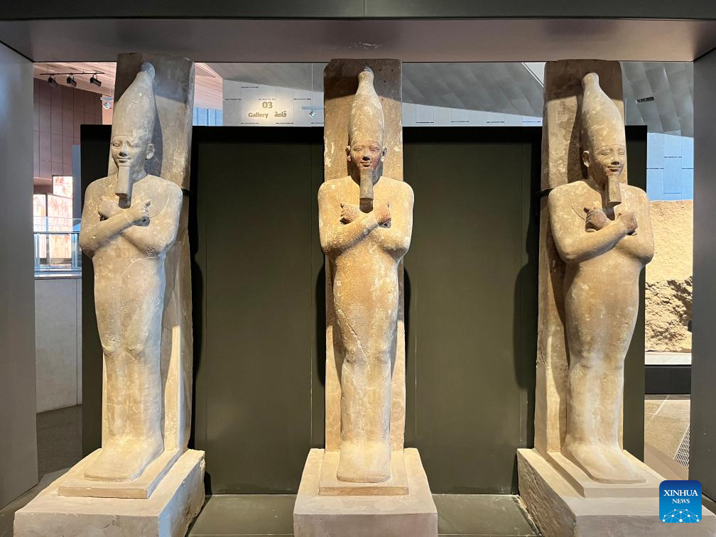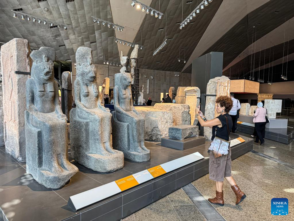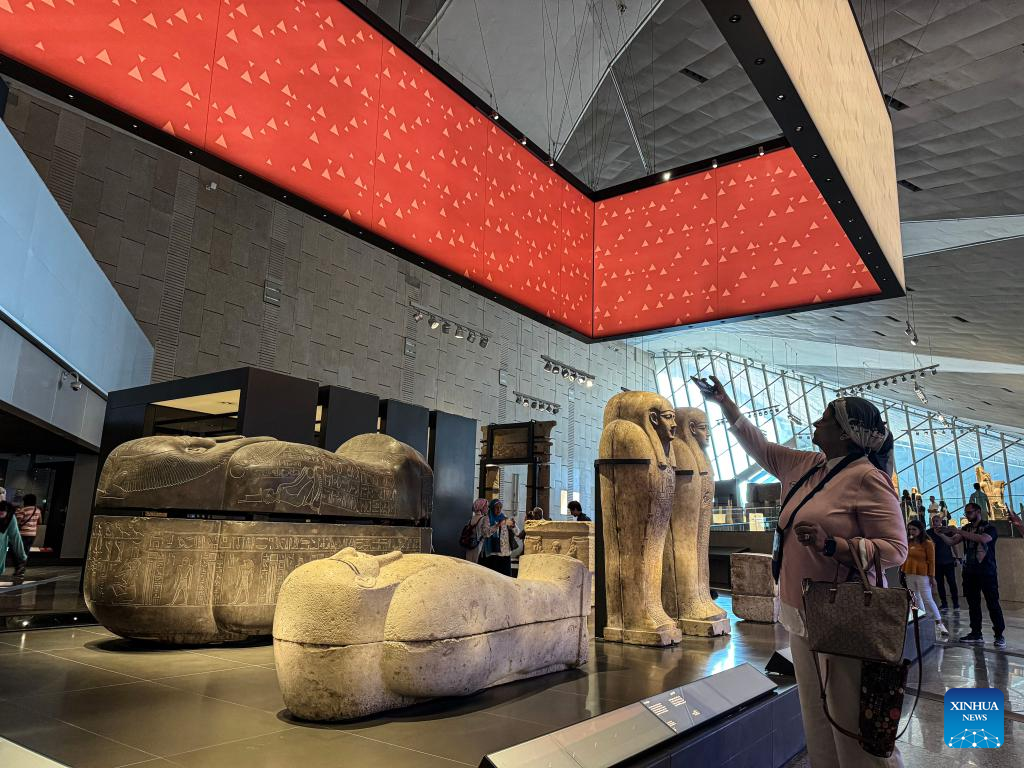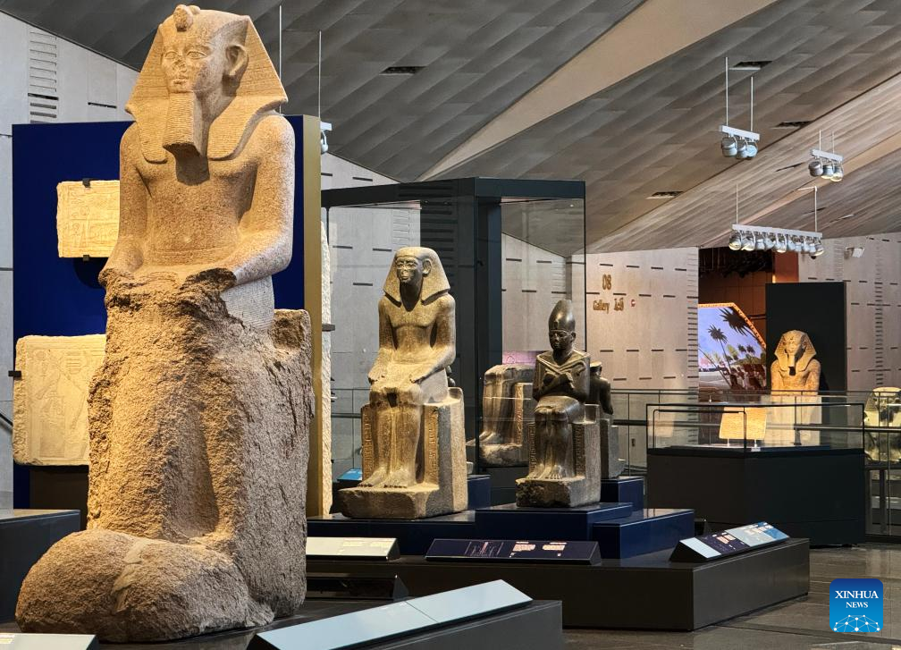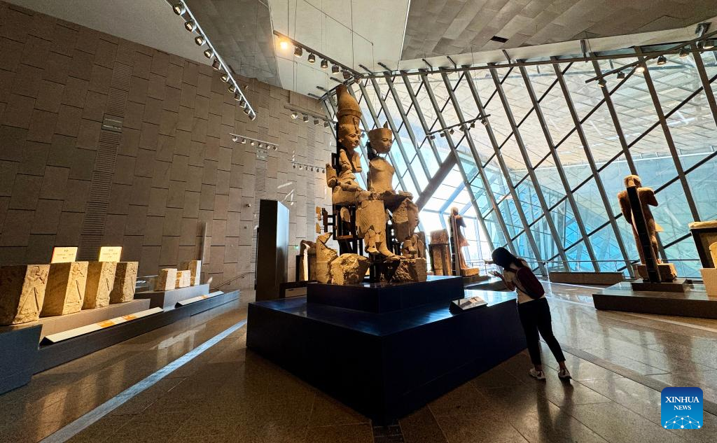 This photo taken on Oct. 15, 2024 shows exhibits at an exhibition hall of the Grand Egyptian Museum in Giza, Egypt. The Grand Egyptian Museum on Tuesday announced trial operations of its Main Galleries, starting from Oct. 16, 2024, offering visitors an exclusive preview of twelve exhibition halls with artifacts spanning from prehistoric times to the Roman era. This trial phase is part of the museum's ongoing efforts to ensure a seamless visitor experience ahead of its official opening. (Xinhua/Sui Xiankai)