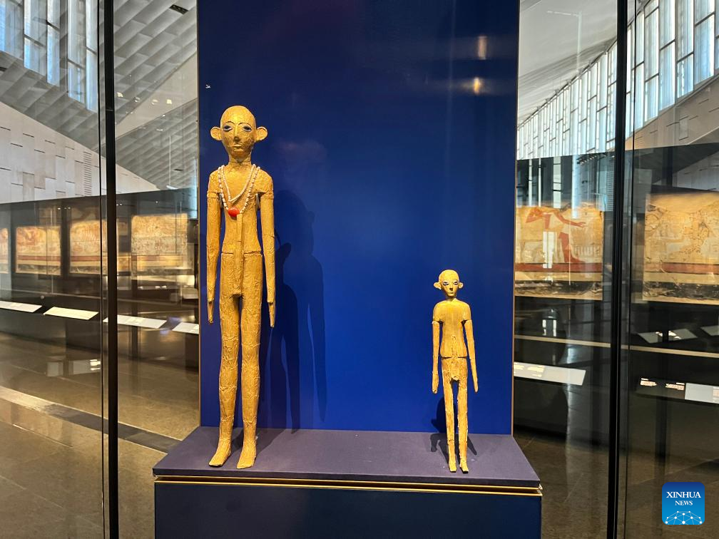 This photo taken on Oct. 15, 2024 shows exhibits at an exhibition hall of the Grand Egyptian Museum in Giza, Egypt. The Grand Egyptian Museum on Tuesday announced trial operations of its Main Galleries, starting from Oct. 16, 2024, offering visitors an exclusive preview of twelve exhibition halls with artifacts spanning from prehistoric times to the Roman era. This trial phase is part of the museum's ongoing efforts to ensure a seamless visitor experience ahead of its official opening. (Xinhua/Ahmed Gomaa)