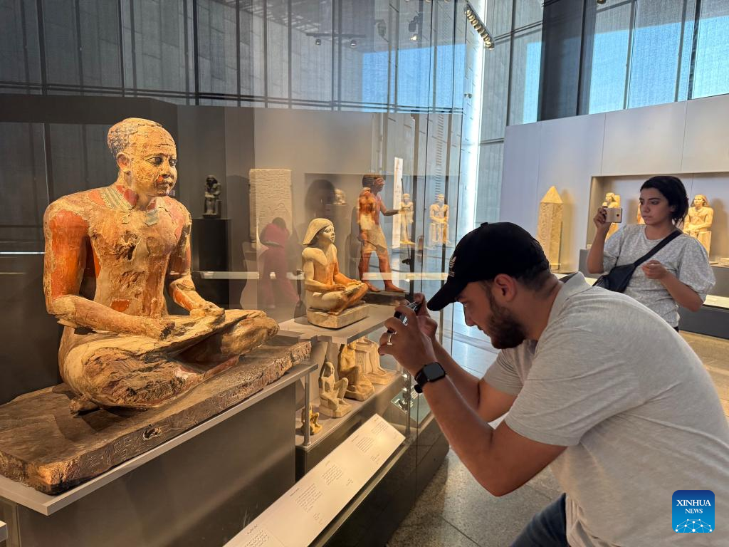 Visitors take photos of exhibits at an exhibition hall of the Grand Egyptian Museum in Giza, Egypt, Oct. 15, 2024. The Grand Egyptian Museum on Tuesday announced trial operations of its Main Galleries, starting from Oct. 16, 2024, offering visitors an exclusive preview of twelve exhibition halls with artifacts spanning from prehistoric times to the Roman era. This trial phase is part of the museum's ongoing efforts to ensure a seamless visitor experience ahead of its official opening. (Xinhua/Ahmed Gomaa)