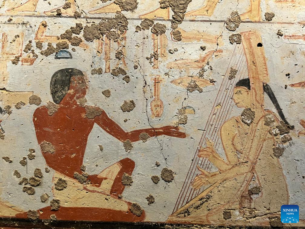 This photo taken on Oct. 15, 2024 shows a mural at an exhibition hall of the Grand Egyptian Museum in Giza, Egypt. The Grand Egyptian Museum on Tuesday announced trial operations of its Main Galleries, starting from Oct. 16, 2024, offering visitors an exclusive preview of twelve exhibition halls with artifacts spanning from prehistoric times to the Roman era. This trial phase is part of the museum's ongoing efforts to ensure a seamless visitor experience ahead of its official opening. (Xinhua/Sui Xiankai)