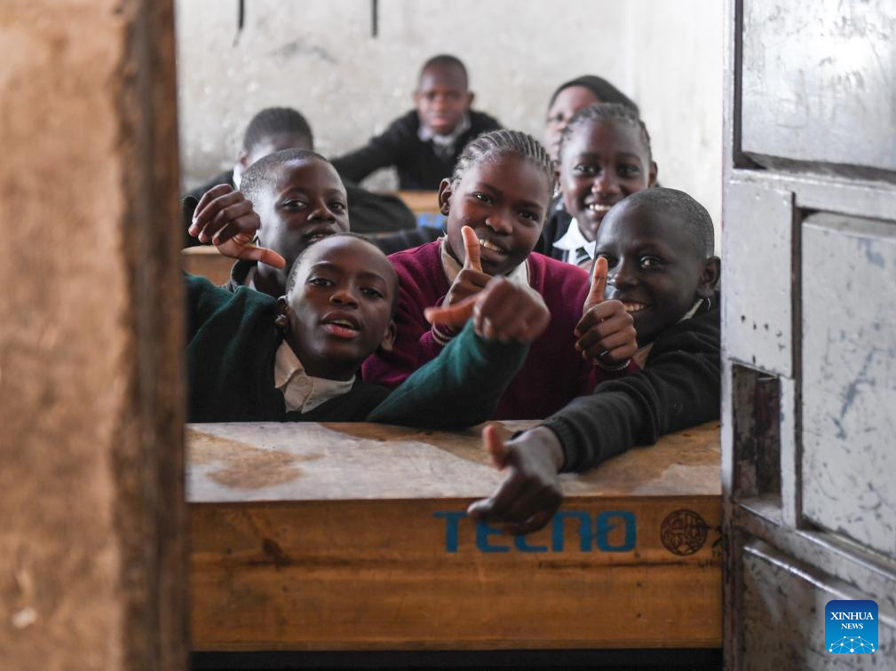 Pupils are pictured with newly donated desks at a school in Mathare slums in Nairobi, Kenya on Oct. 15, 2024. (Xinhua/Li Yahui)