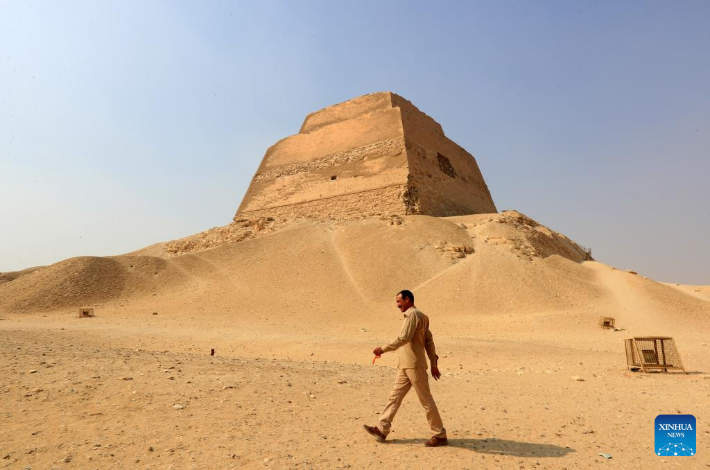 A staff member walks near the Meidum Pyramid in Beni Suef Governorate, Egypt, Oct. 16, 2024. Meidum Pyramid is thought to be built by Pharaoh Sneferu, the first pharaoh of the Fourth Dynasty of ancient Egypt. The pyramid has a history of around 4,600 years. (Xinhua/Sui Xiankai)
