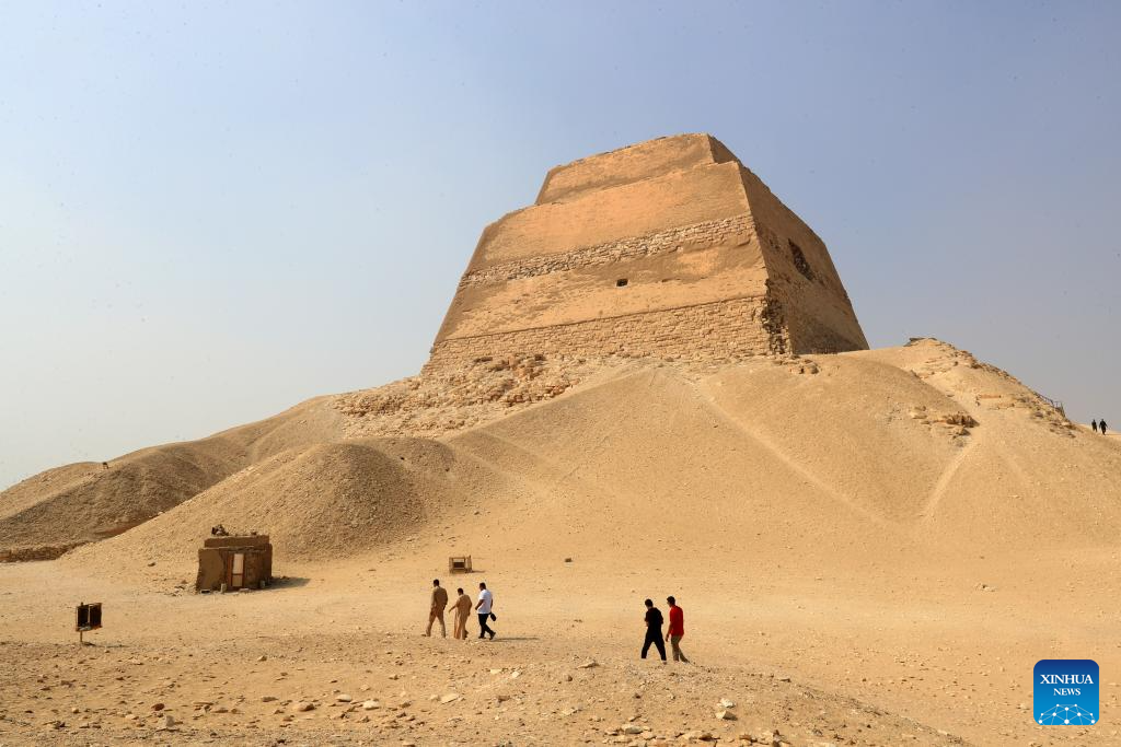 Tourists accompanied by staff members visit the Meidum Pyramid in Beni Suef Governorate, Egypt, Oct. 16, 2024. Meidum Pyramid is thought to be built by Pharaoh Sneferu, the first pharaoh of the Fourth Dynasty of ancient Egypt. The pyramid has a history of around 4,600 years. (Xinhua/Sui Xiankai)
