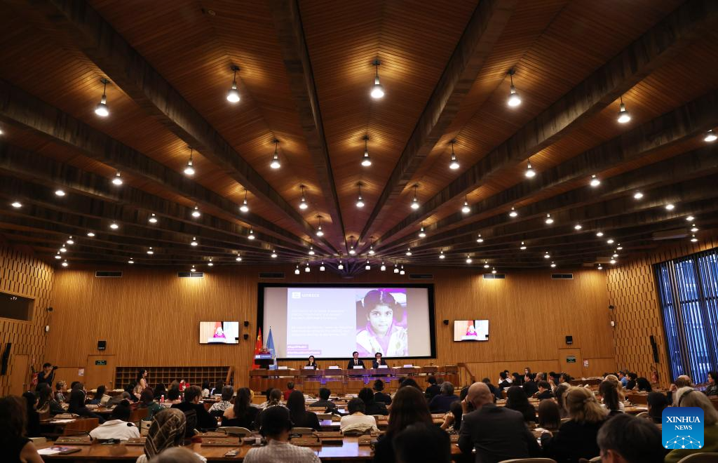 This photo taken on Oct. 16, 2024 shows the 2024 United Nations Educational, Scientific and Cultural Organization (UNESCO) Prize for Girls' and Women's Education award ceremony in Paris, France. Two organizations from Uganda and Zambia were awarded the prize. The UNESCO Prize for Girls' and Women's Education, established by China in cooperation with UNESCO, is the organization's only prize for promoting girls' and women's education. It plays a vital role in publicizing the concept of gender equality in education and related good practices and in implementing gender equality as a global priority. (Xinhua/Gao Jing)