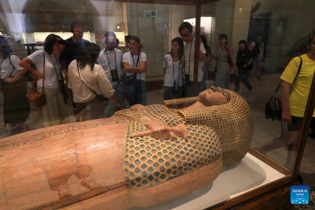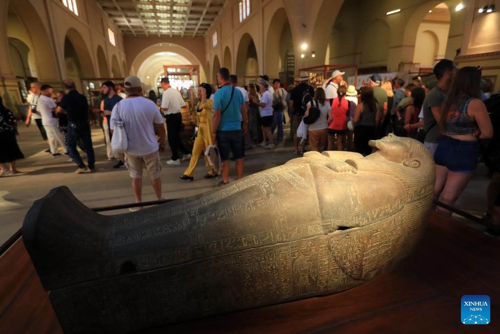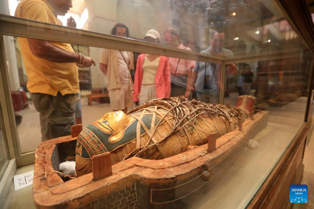 Tourists look at an intact mummy at Egyptian Museum in Cairo, Egypt, on Oct. 18, 2024. Egypt has entered its peak tourism season as the weather becomes cooler. (Xinhua/Sui Xiankai)