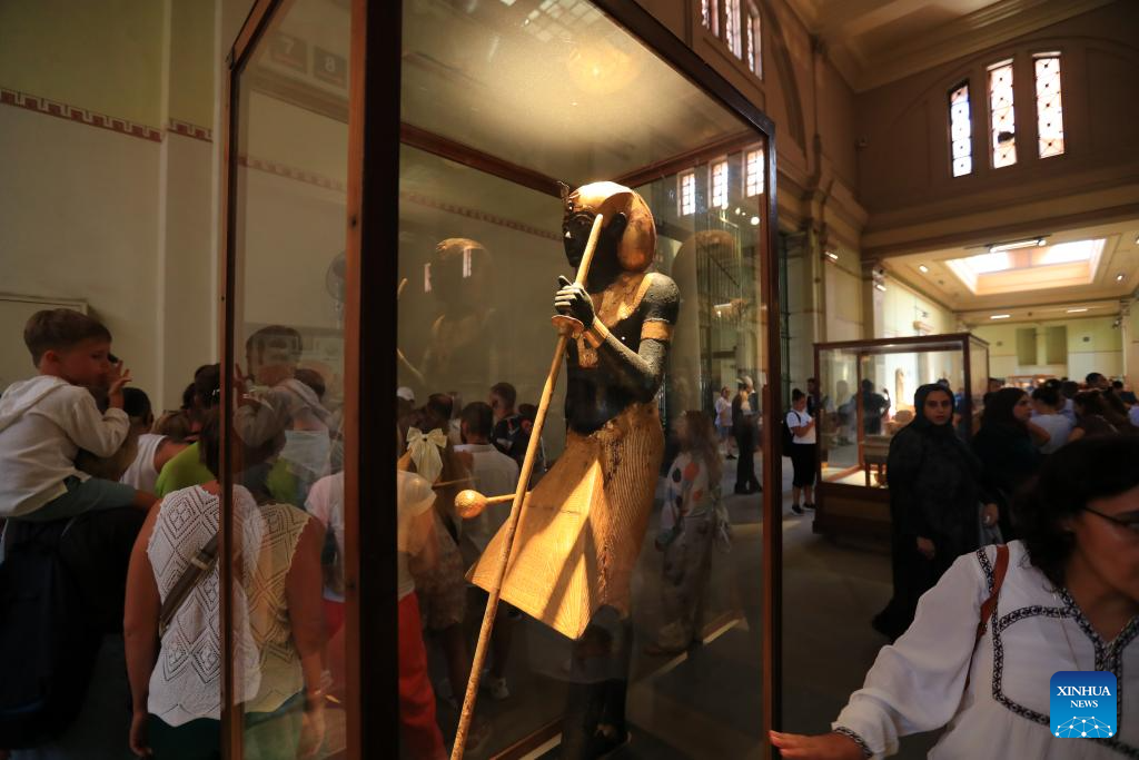 Tourists look at exhibits from the tomb of ancient Egyptian King Tutankhamun at Egyptian Museum in Cairo, Egypt, on Oct. 18, 2024. Egypt has entered its peak tourism season as the weather becomes cooler. (Xinhua/Sui Xiankai)