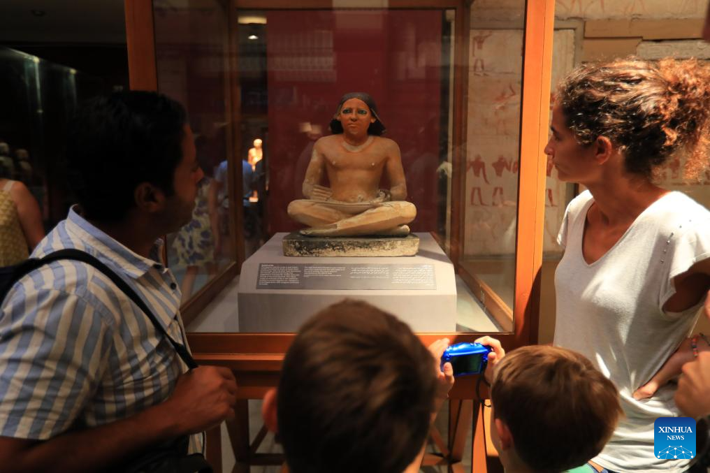 Tourists look at a seated statue of a scribe at Egyptian Museum in Cairo, Egypt, on Oct. 18, 2024. Egypt has entered its peak tourism season as the weather becomes cooler. (Xinhua/Sui Xiankai)