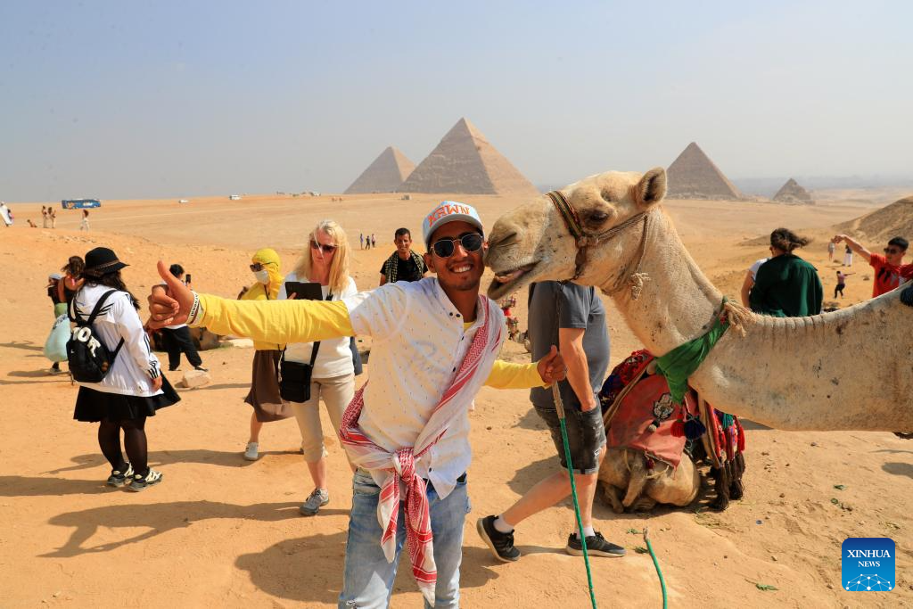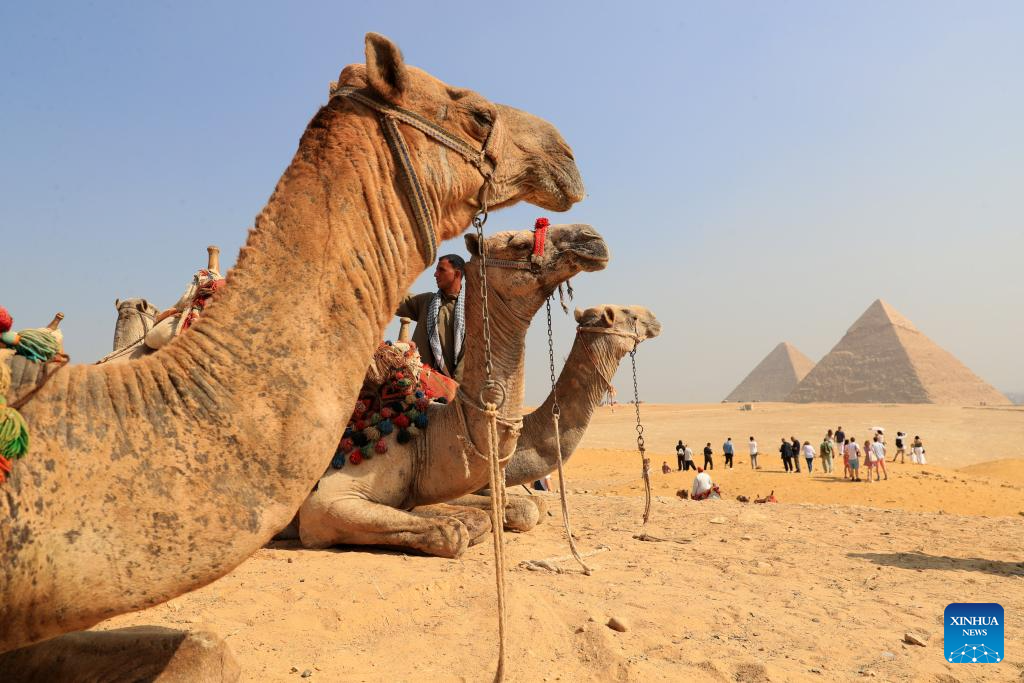 A vendor poses for a photo with his camel at the Giza Pyramids scenic spot in Giza, Egypt, on Oct. 19, 2024. Egypt has entered its peak tourism season as the weather becomes cooler. (Xinhua/Sui Xiankai)