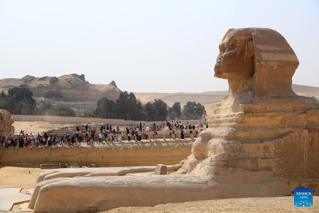 Tourists visit the Sphinx at Giza Pyramids scenic spot in Giza, Egypt, on Oct. 19, 2024. Egypt has entered its peak tourism season as the weather becomes cooler. (Xinhua/Sui Xiankai)