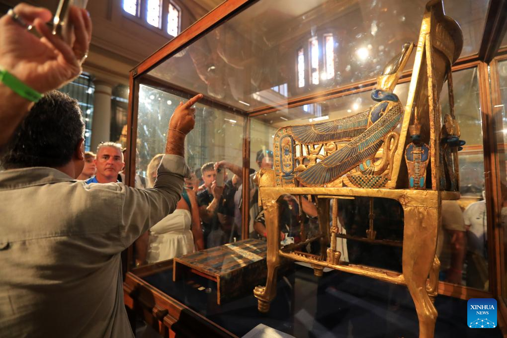 Tourists look at ancient Egyptian King Tutankhamun's gilded wooden throne at Egyptian Museum in Cairo, Egypt, on Oct. 18, 2024. Egypt has entered its peak tourism season as the weather becomes cooler. (Xinhua/Sui Xiankai)