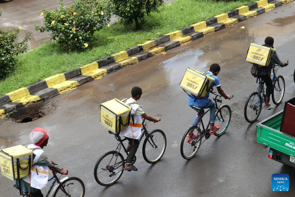 Backpack bikers of Pick Delivery ride on the street in Adama, the capital of Ethiopia's Oromia regional state, on Oct. 11, 2024. (Xinhua/Misikir Temesgen)