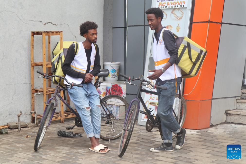 Amanuel Demissie (R), a backpack biker of Pick Delivery, chats with his coworker in Adama, the capital of Ethiopia's Oromia regional state, on Oct. 11, 2024. (Xinhua/Misikir Temesgen)