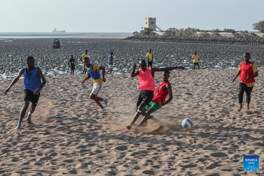People play football on the beach in Djibouti City, Djibouti, on Nov. 5, 2024. Djibouti, located at the tip of the Horn of Africa, borders Somalia to the southeast, Eritrea to the north, and is adjacent to Ethiopia to the west and south. With a 372-km-long coastline along the Gulf of Aden, it sits at the strategic Bab el Mandeb Strait, connecting the Red Sea to the Indian Ocean. Its advantageous location and natural harbors establish it as a key regional trade and transshipment hub. (Xinhua/Liu Fangqiang)