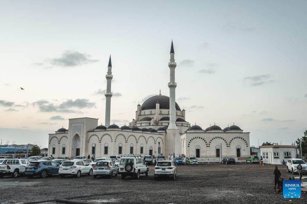 This photo taken on Nov. 5, 2024 shows a landmark mosque in Djibouti City, Djibouti. Djibouti, located at the tip of the Horn of Africa, borders Somalia to the southeast, Eritrea to the north, and is adjacent to Ethiopia to the west and south. With a 372-km-long coastline along the Gulf of Aden, it sits at the strategic Bab el Mandeb Strait, connecting the Red Sea to the Indian Ocean. Its advantageous location and natural harbors establish it as a key regional trade and transshipment hub. (Xinhua/Wang Guansen)