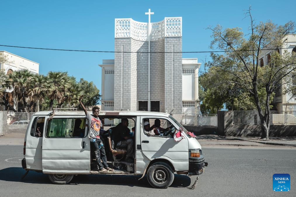 A van runs past a landmark church in Djibouti City, Djibouti, on Nov. 6, 2024. Djibouti, located at the tip of the Horn of Africa, borders Somalia to the southeast, Eritrea to the north, and is adjacent to Ethiopia to the west and south. With a 372-km-long coastline along the Gulf of Aden, it sits at the strategic Bab el Mandeb Strait, connecting the Red Sea to the Indian Ocean. Its advantageous location and natural harbors establish it as a key regional trade and transshipment hub. (Xinhua/Wang Guansen)