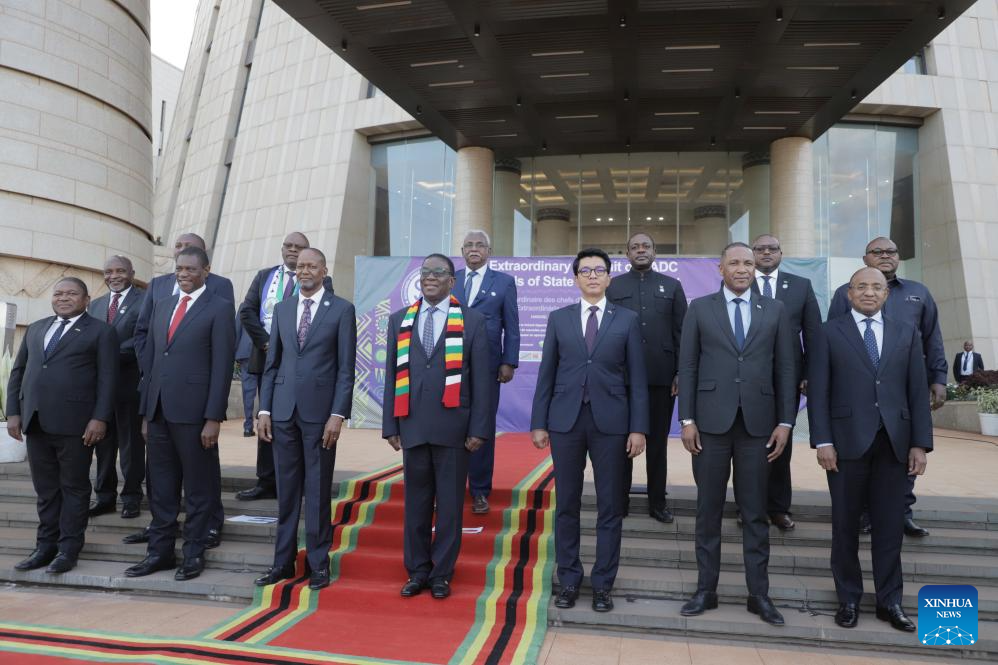 State heads and representatives of the Southern African Development Community (SADC) pose for a group photo during an extraordinary summit in Harare, Zimbabwe, on Nov. 20, 2024. The Southern African Development Community (SADC), a regional bloc, has decided to extend the mandate of its peacekeeping force in the Democratic Republic of the Congo (DRC) by one year amid continued hostilities in the country's eastern region. (Photo by Shaun Jusa/Xinhua)