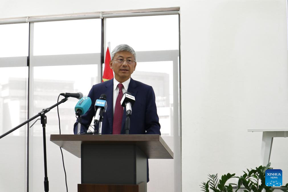 Chen Hai, Chinese ambassador to Ethiopia, speaks at the opening ceremony of the Chinese language training program for Ethiopian professional tour guides in Addis Ababa, capital of Ethiopia, on Nov. 26, 2024. (Xinhua/Liu Fangqiang)