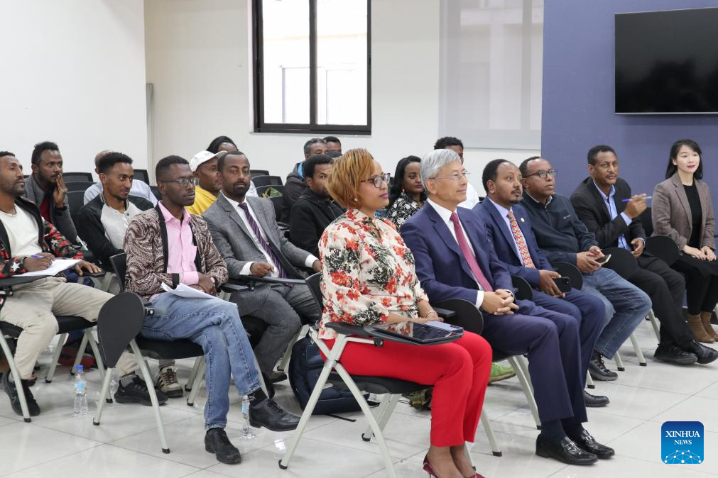 Guests and students attend the opening ceremony of the Chinese language training program for Ethiopian professional tour guides in Addis Ababa, capital of Ethiopia, on Nov. 26, 2024. (Xinhua/Liu Fangqiang)