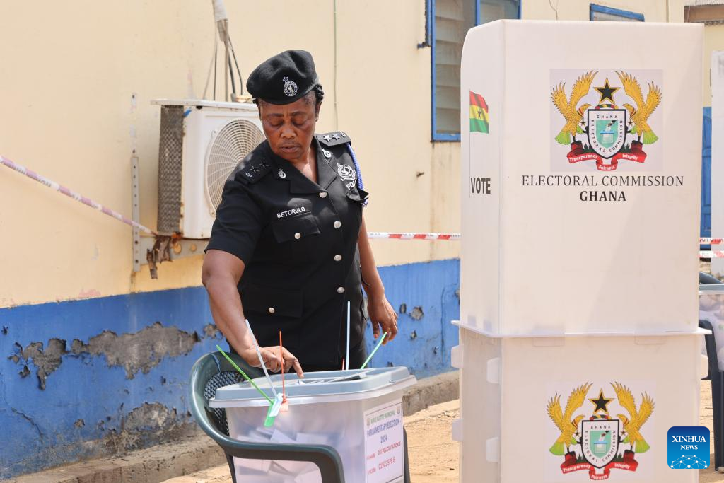 A voter casts a ballot during special voting in Accra, Ghana, on Dec. 2, 2024. Polls opened early Monday at selected polling stations across Ghana for special voting ahead of the general elections scheduled for Dec. 7. The special voting allows individuals, including security personnel, journalists, electoral commission officials, and civil society activists, who will be performing their duties away from polling stations during the main elections, to cast their ballots. (Photo by Seth/Xinhua)