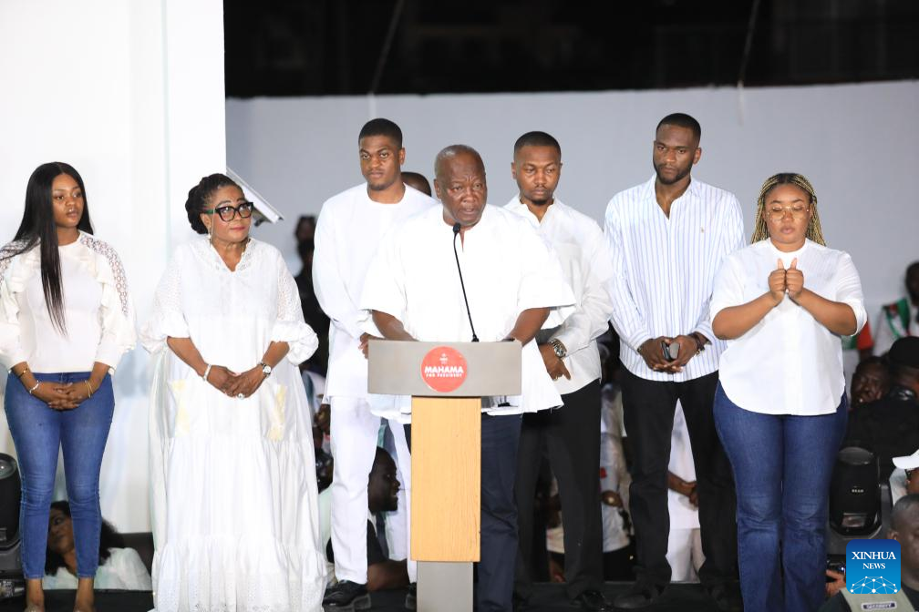 Ghana's president-elect John Dramani Mahama (front) delivers a speech after winning the 2024 presidential election in Accra, Ghana, Dec. 9, 2024. (Xinhua/Seth)